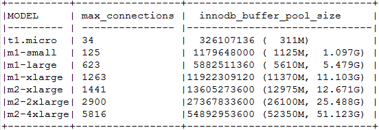 All default MySQL settings that would normally be written in my.cnf. All values are the same in RDS with the exception of two which are mentioned below: